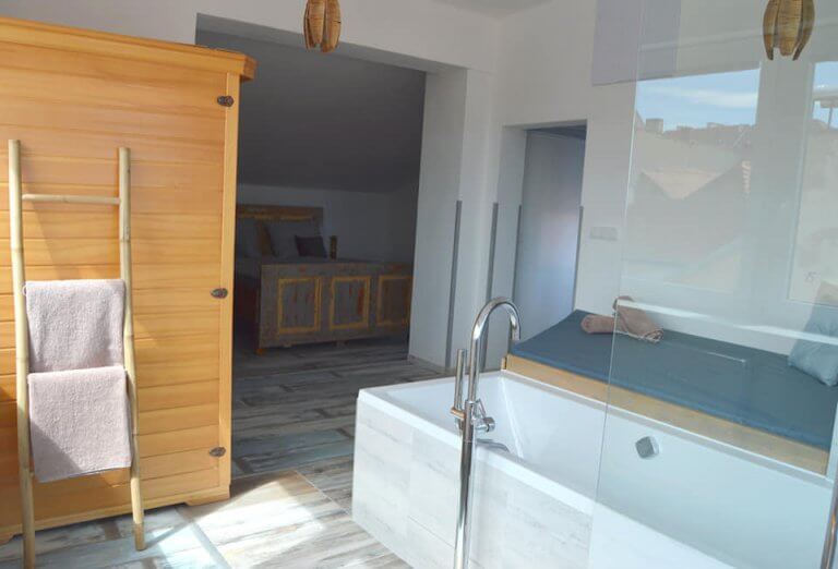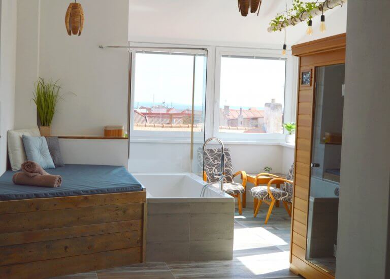 Dům u lázní nabízí kombinaci soukromého ubytování v apartmánu a zároveň ideální dostupnost všech atraktivit, které město nabízí, neboť se nachází přímo v centru starobylého města Znojma. Dům u lázní poskytuje možnost ubytovat se ve čtyřech různých typech apartmánů, které jsou vybavené stylovým a ručně vyráběným nábytkem. Střešní apartmán v horním patře nabízí unikátní výhledy na dominantu města- radniční věž a navíc nabízí ve svém vybavení také saunu.